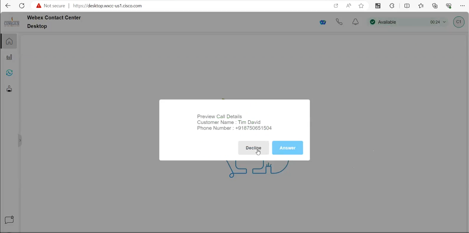 Agent with a preview of calls within the Webex Contact Center Agent desktop. Agents will now have the advantage of call previews directly within the Webex Contact Center Agent desktop. This enhancement allows agents to preview calls, providing valuable information before answering. This feature aims to streamline the workflow and enhance the overall efficiency of agents by offering a glimpse of relevant details prior to engaging with the caller.